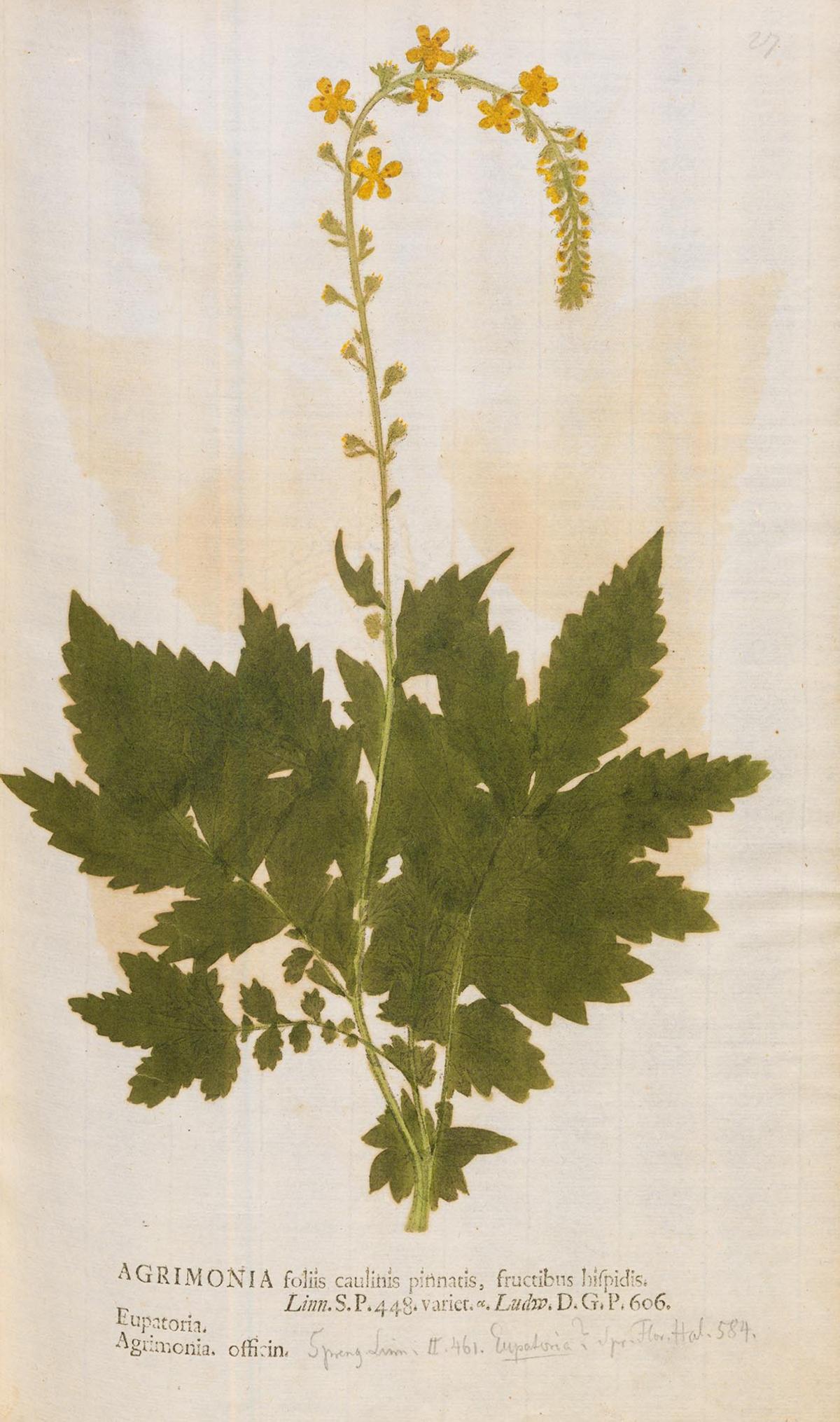 Kleiner Odermennig (Agrimonia eupatoria L.) In: Kniphof, Johann Hieronymus: Botanica in originali seu herbarium vivum […]. [2. Aufl.]. Centur. 1-12. Halle: Trampe, 1757-1764. Halle, Franckesche Stiftungen: BFSt: 38 A 12